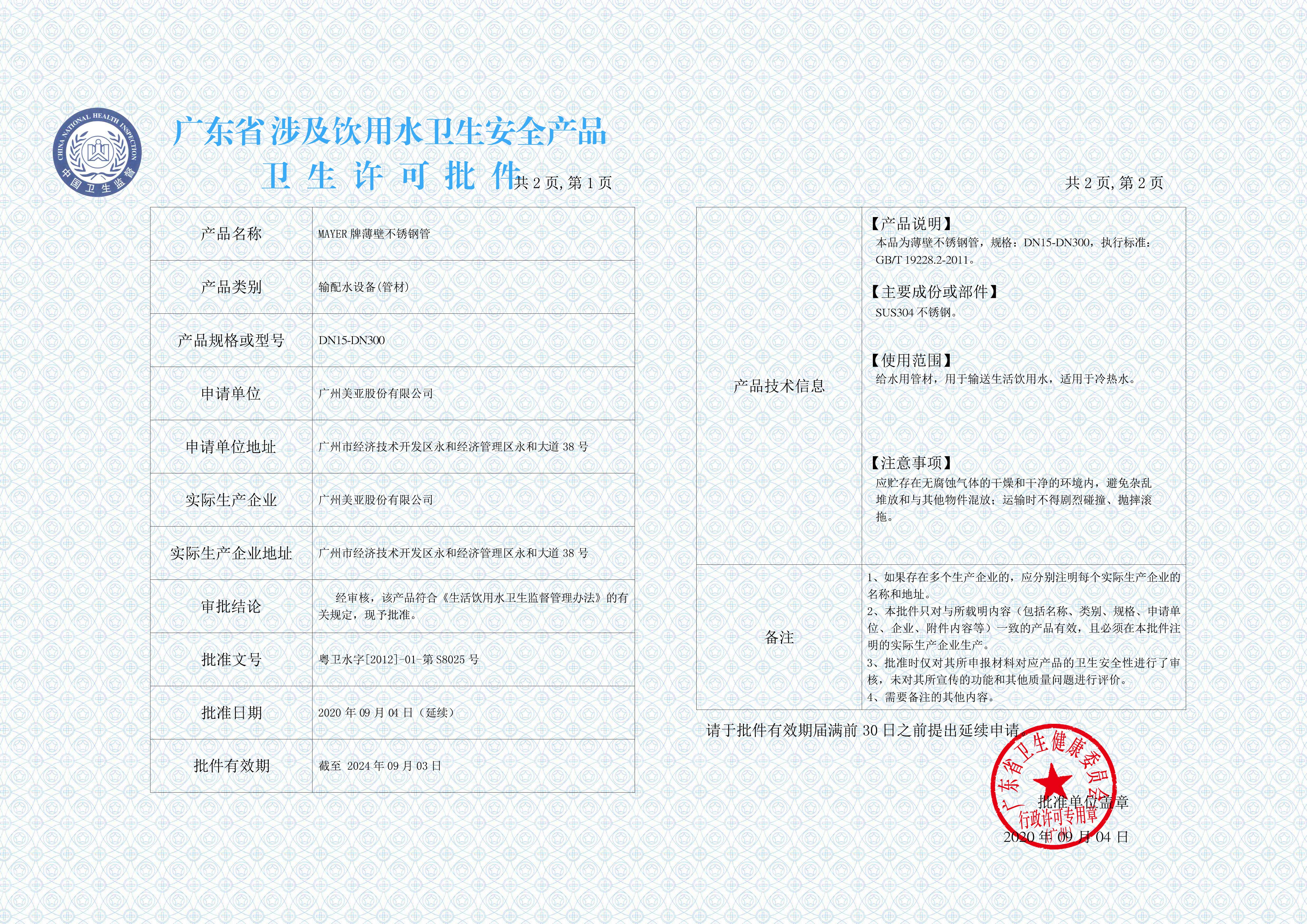 304不锈钢管件卫生许可证批件